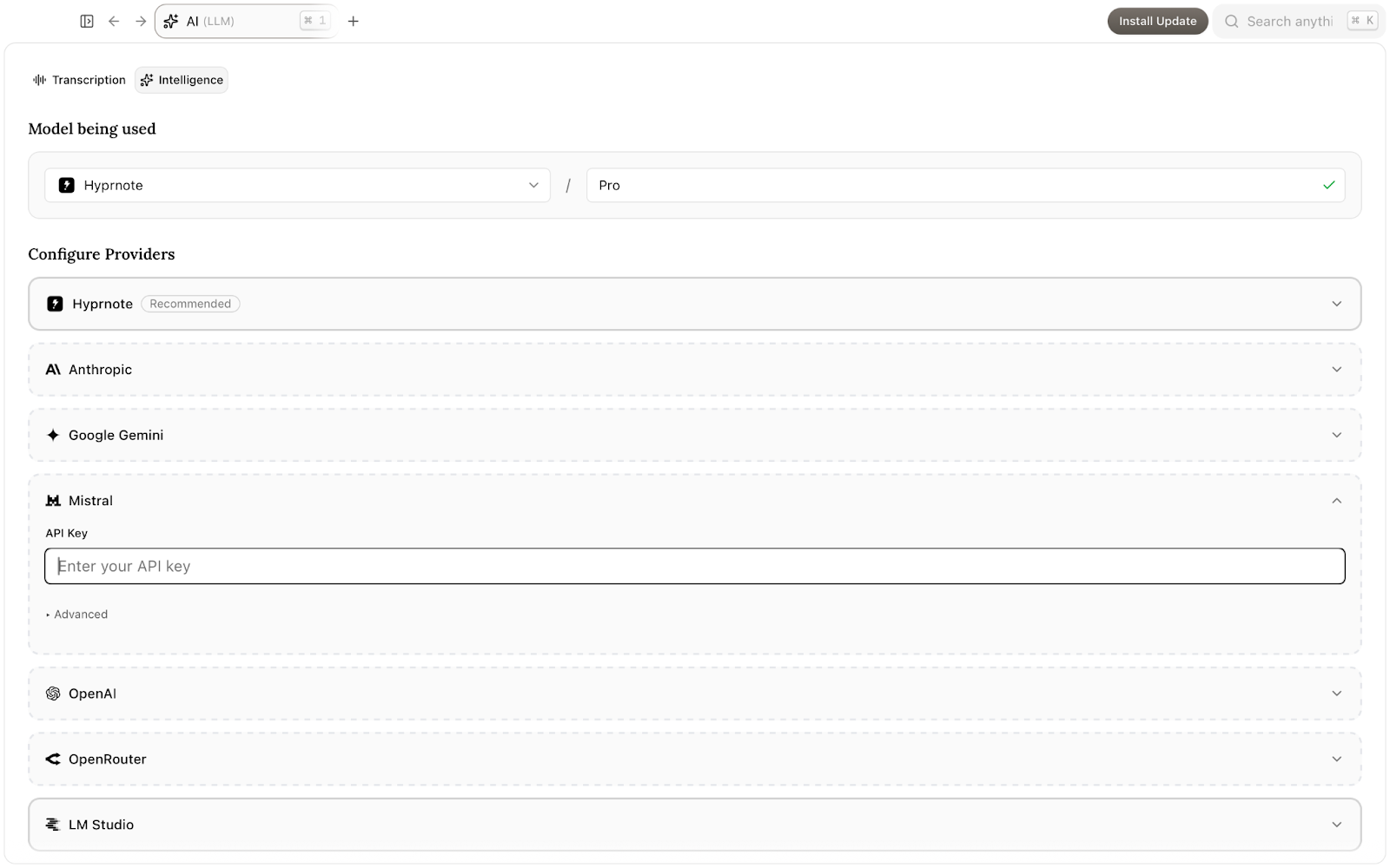 The workflow is simple: record, transcribe locally, summarize with your own Mistral key. You choose which model runs. You can swap to Anthropic, OpenAI, or a local Ollama model any time without losing your files or your history.